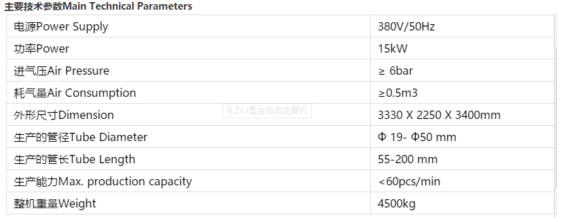 B.ZJ-I型全自動注肩機是我公司自主研發(fā)的高科技新型軟管注肩專用機器設(shè)備。該型注肩機所有動作均由大型PL.C智能控制觸摸顯示屏人機實際操作,集機、電、氣于一體化,具備生產(chǎn)效率高、能耗低、實際操作簡便、故障自動報警、性能穩(wěn)定、無三廢等優(yōu)點。選用注、吐、擠成型、焊合的方式方法,可以為鋁塑復(fù)合管、塑料管注上塑料肩部。生產(chǎn)的肩部無合??p線,外形美觀大方、穩(wěn)固。該設(shè)備可與我公司生產(chǎn)的B.GLS-II復(fù)合軟